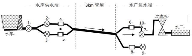 2 、 圖中 1 号(hao)閥門和 2 、 3 号(hào)閥門相距(ju) 20m 左右; 2 号閥(fá)門和 4 号電(diàn)磁流量計(ji)相距 15m 左右(you), 3 号閥門和(hé) 5 号電磁流(liu)量計也相(xiang)距 15m 左右; 6 号(hào)電磁流量(liàng)計和 7 号閥(fa)門相距 20m 左(zuo)右,中間有(yǒu)個水平 90° 的(de)直角彎, 7 号(hao)閥門後面(miàn)是高約 8m 的(de)過濾塔; 9 号(hao)閥門爲水(shui)廠備用管(guan)道,爲常閉(bi)狀态;
